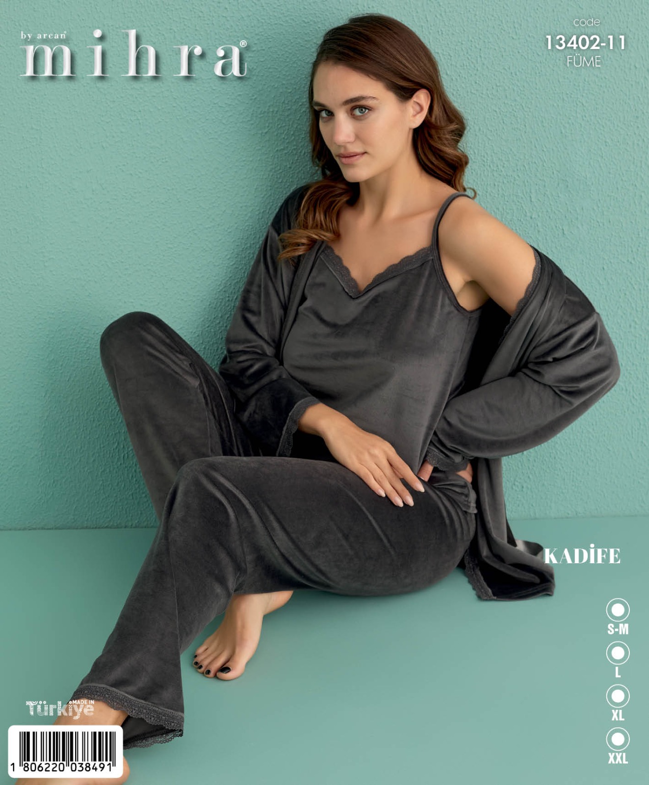 Mihra Kadife 3'lü Pijama Takımı, kadınların evde ya da yatakta rahat ve şık hissetmeleri için özenle tasarlanmıştır. Ayrıca, hediye olarak da tercih edilecek ideal bir seçenektir. Sevdiklerinize özel günlerde şıklığı ve konforu bir arada sunarak onları memnun edebilirsiniz.