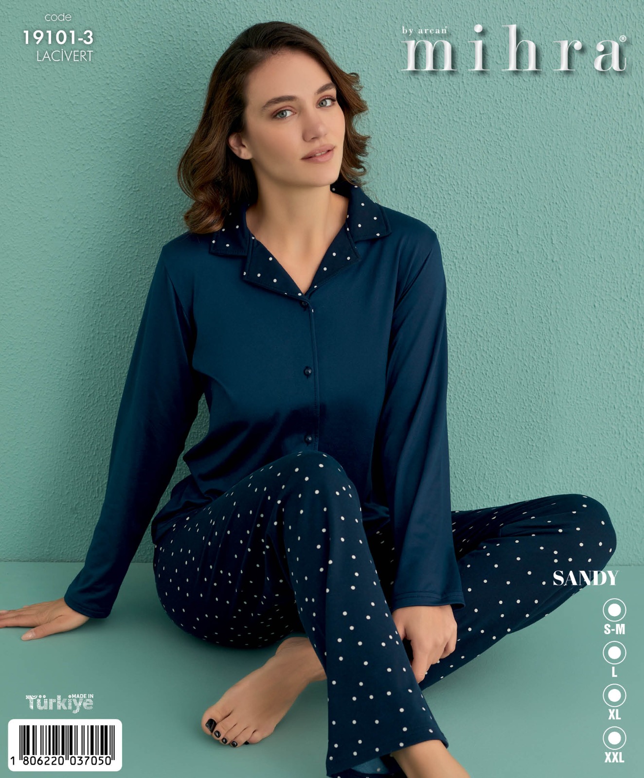 Mihra Sandy Düğmeli Pijama Takımı, üst ve alt olmak üzere iki parçadan oluşmaktadır. Üst kısmında yaz ve kış mevsimlerinde kullanabileceğiniz, ince ve hafif bir tasarım yer alır. Bu tasarım, serin yaz gecelerinde size sıcaklık sağlarken, kış aylarında da giydiğiniz iç çamaşırı altında hoş bir görünüm sunar.